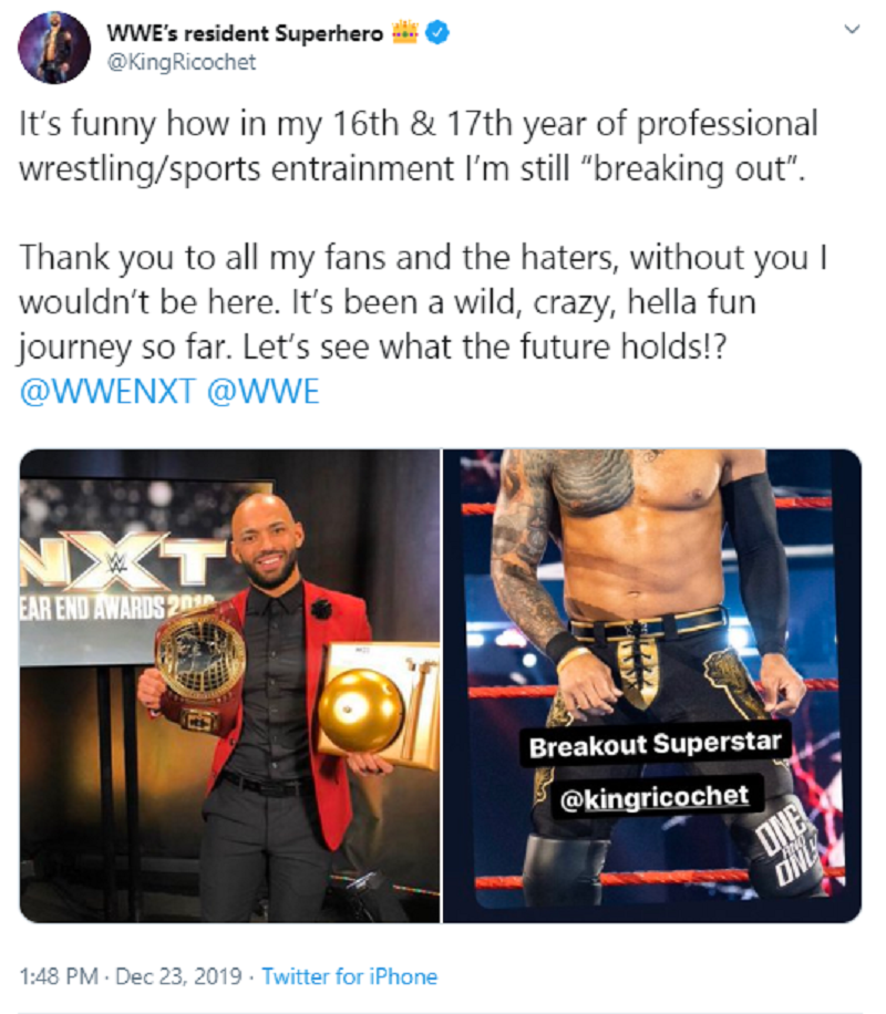For those that may have missed it, I reported on Ricochet being a nominee for the Breakthrough Superstar Award on WWE Backstage. Though it’s an honor, and a step up the ladder like his NXT breakthrough Superstar Award in 2018, he’s unhappy and frustrated with the moniker, an dhe has reason to.