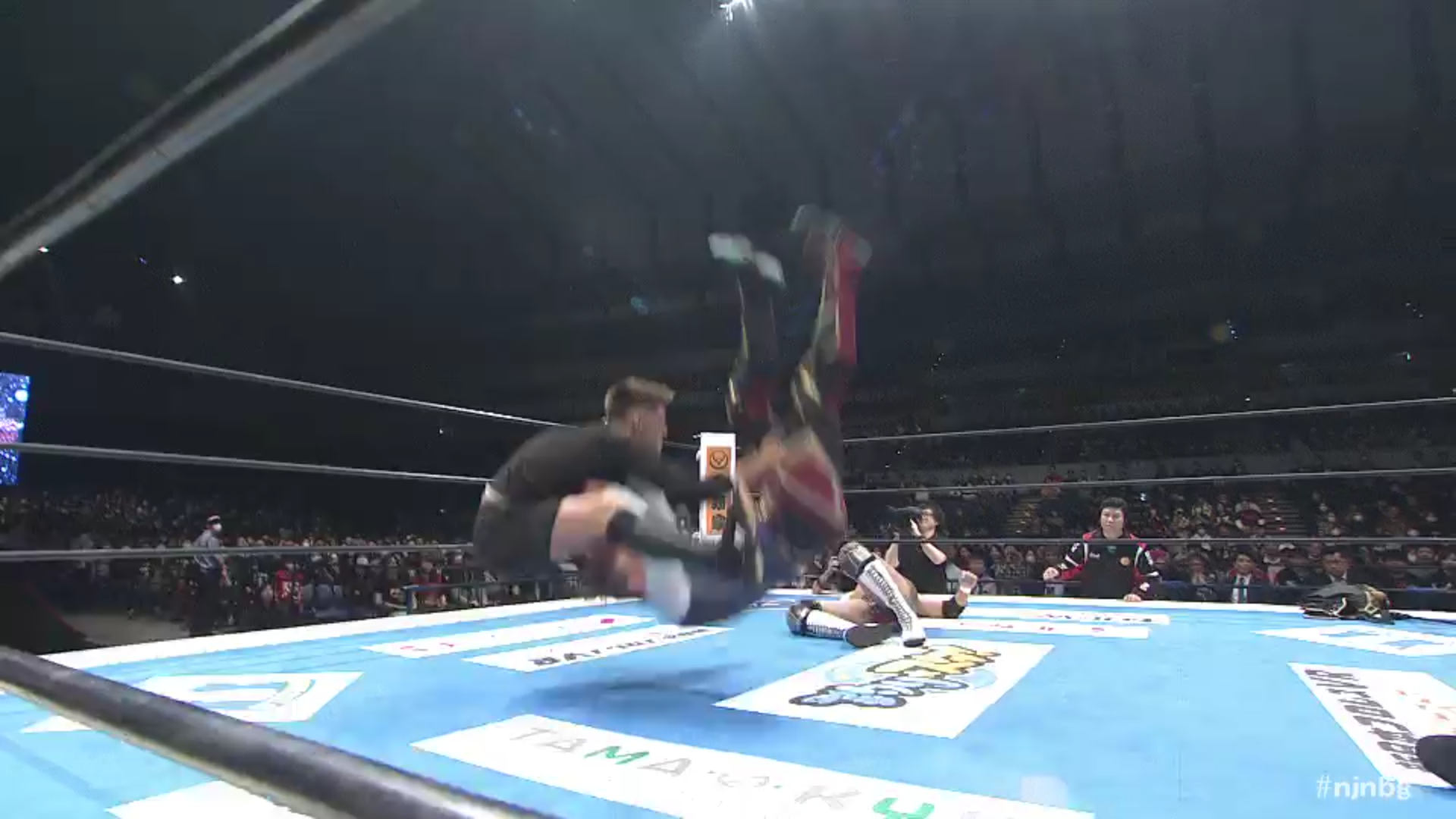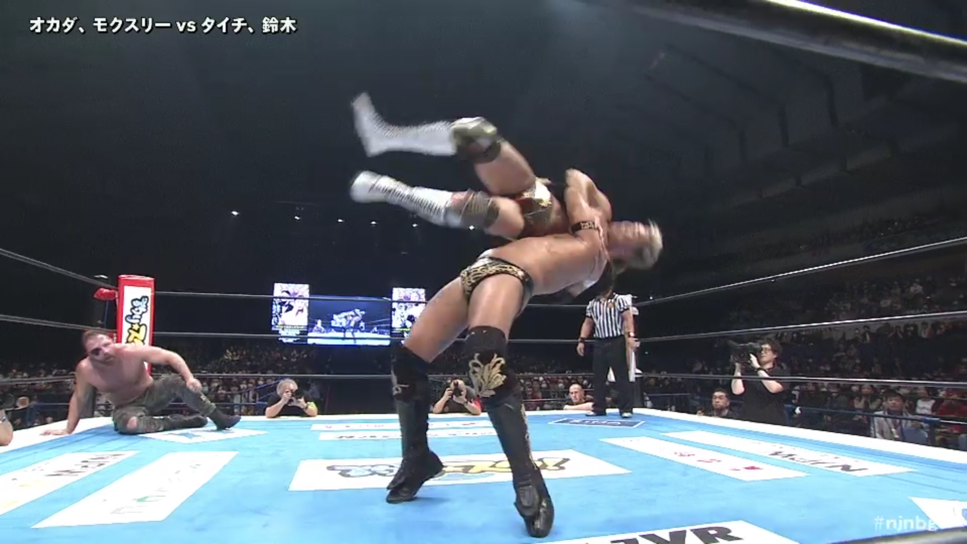 Taichi Throws Okada With The Dangerous T Backdrop In Tribute Of His Senpai Toshiaki Kawada On Night One Of The New Beginning In Sapporo  As Jon Moxley Looks On In The Corner. February 1, 2020 via New Japan World