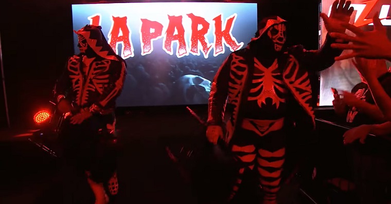 The spike that Samael had ends up in El Hijo de L.A Park’s hands and he catches it to the throat like McDonald’s Sprite! This match ends with Hijo moonsaulting to the outside and onto Simon Gotch and some lumberjacks while L.A Park catches Samael with his corkscrew senton for the pin.