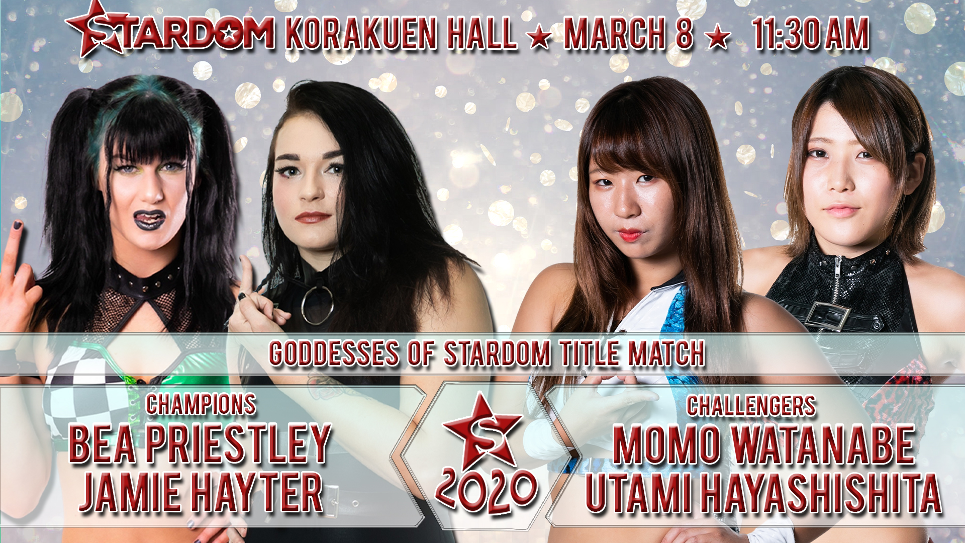 The second co-headline saw Oedo Tai members Bea Priestley/Jamie Hayter defend their Goddesses of Stardom Championship against Queen’s Quest members Momo Watanabe/Utami Hayashishita. Watanabe and Hayashishita also wanted revenge against Priestley for turning her back on Queen’s Quest.