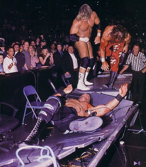 Here we have Trips in his power trip phase when he and Stephanie were terrorizing the company. His feud with Steve Austin had gotten so bad that the only way to settle things was in a bout that was three matches in one!  Bonus points: the last two were matches that both Austin and Triple H specialized in so it could’ve gone either way. The Game took it in two straight after Austin took the first match.