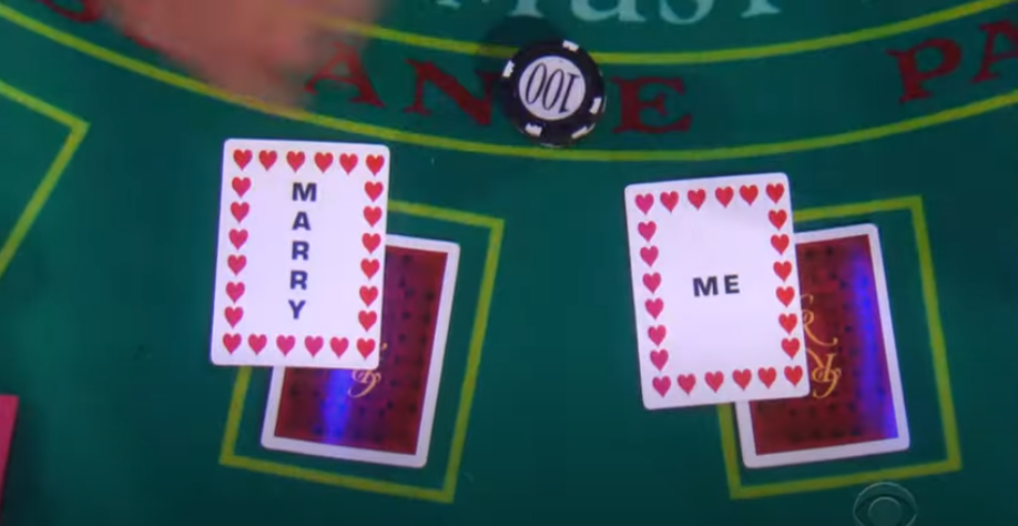 Lauren’s mood started to brighten as they danced and drank champagne, but it was when she started winning at blackjack that she really became happy. It was around this time that the next part of Michael’s plan went into effect, as the casino dealer turned Lauren’s cards over. On the other side “Marry Me” was written plain as day for her to see. Will she accept?