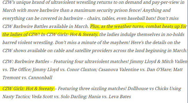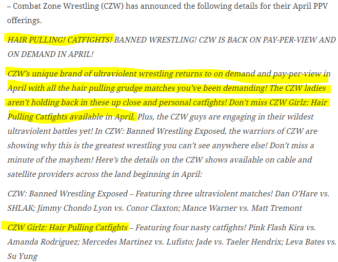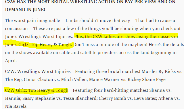 The above reads, “Two years ago, CZW entered into a licensing agreement with a national media distributor to license CZW and WSU footage. That company has the right to utilize the footage without limitation. They have repackaged and renamed shows as it is their right to do so. Our athletes, regardless of gender, are just that, athletes, whom we are proud of and appreciate. We stand behind the ring action in all our footage.”