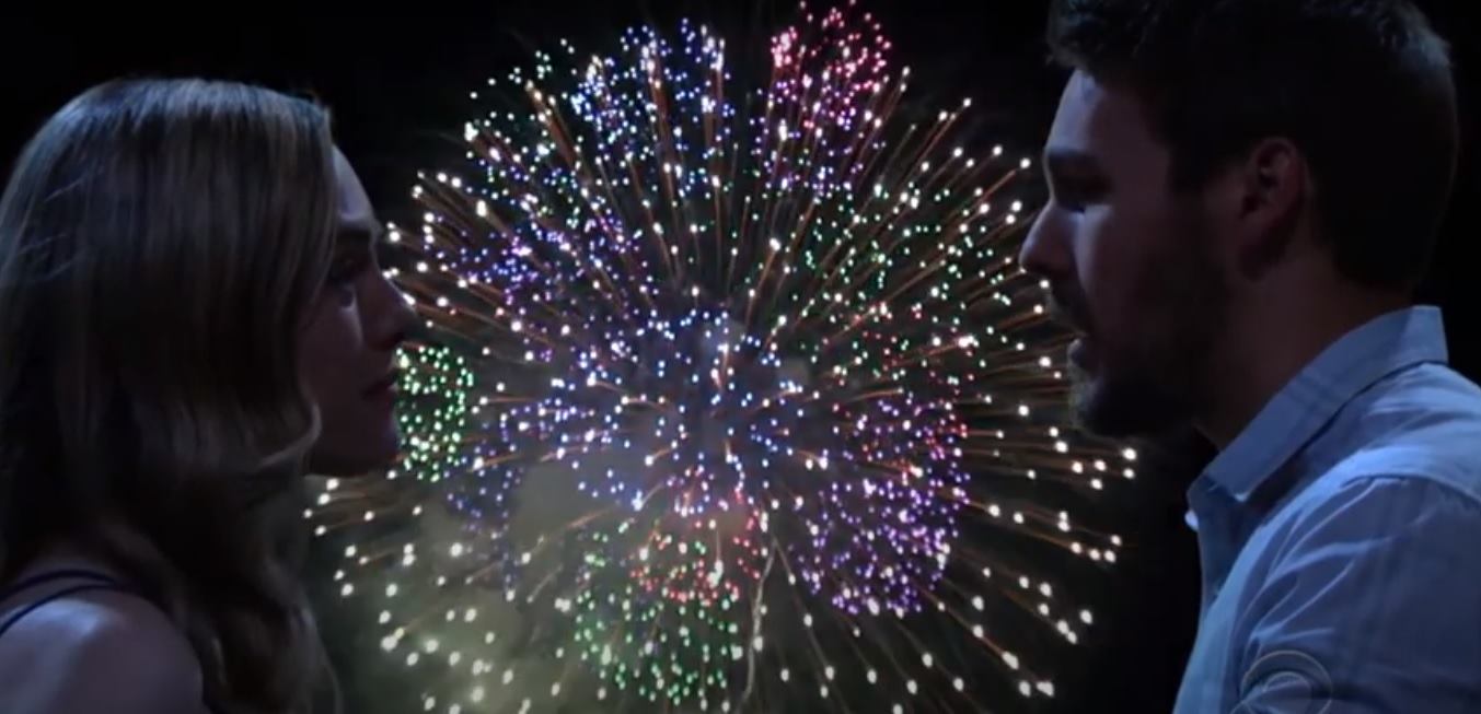 Hope Logan (Annika Noelle) and Liam are watching the same fireworks on a balcony at Forrester Creations with other Forrester employees.