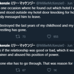 On June 18th, while numerous Speaking Out stories were being shared on Twitter professional wrestler Millie McKenzie, who has wrestled throughout Europe and Japan shared her unfortunate experience with Travis Banks. The following tweets are from June 18th and June 19th, all of which detail how Banks abused his position as her trainer to engage in a relationship with the at the time 17-year-old McKenzie.