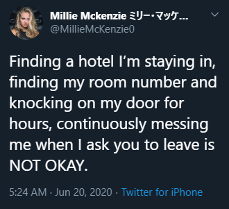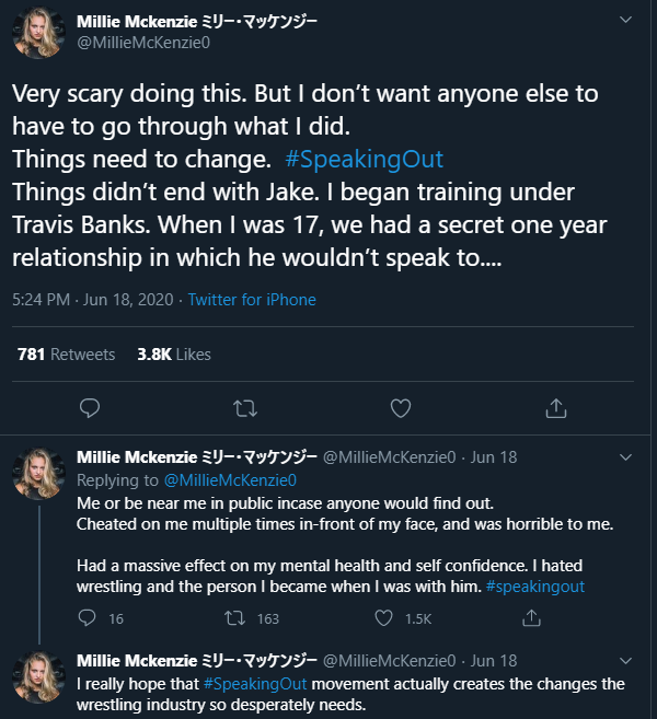 On June 18th, while numerous Speaking Out stories were being shared on Twitter professional wrestler Millie McKenzie, who has wrestled throughout Europe and Japan shared her unfortunate experience with Travis Banks. The following tweets are from June 18th and June 19th, all of which detail how Banks abused his position as her trainer to engage in a relationship with the at the time 17-year-old McKenzie.