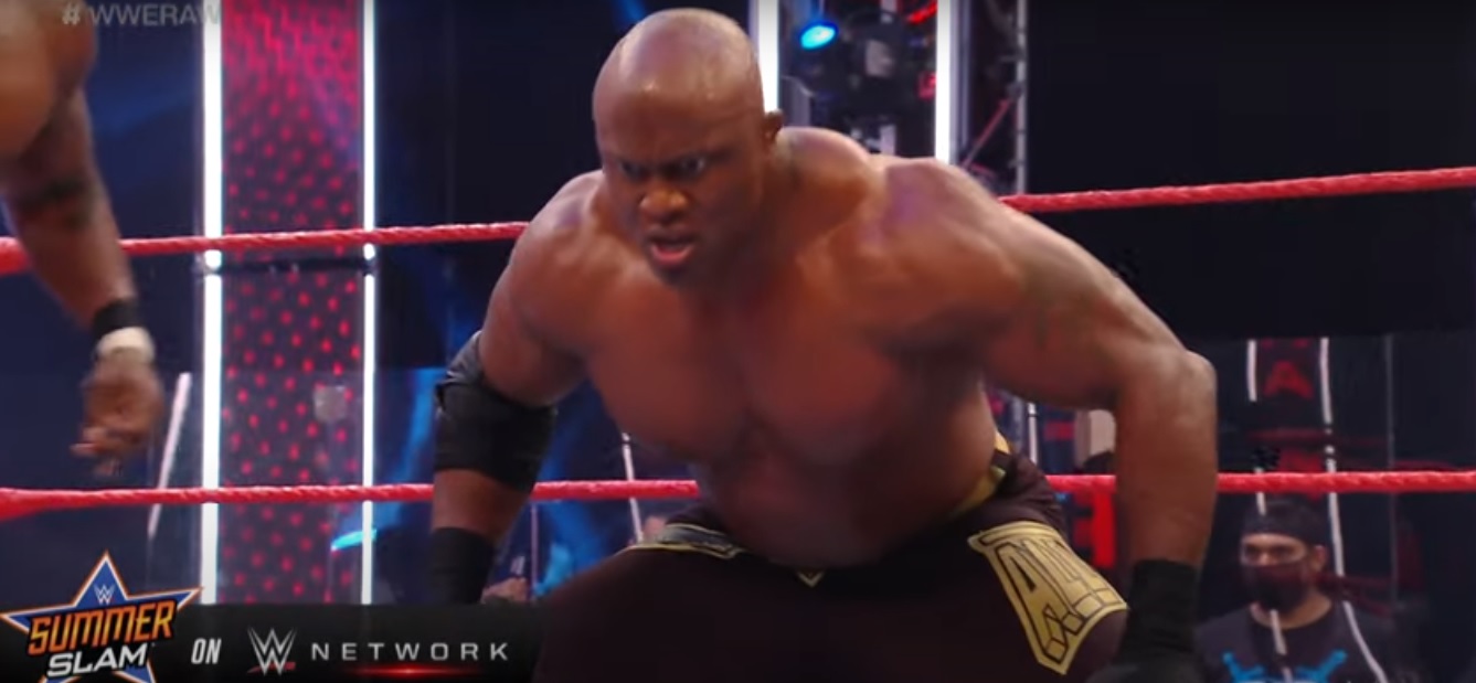 When he was tagged in, Lashley ran over Ali, then knocked Ricochet and Crews off the apron.