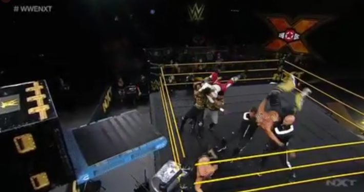 Swerve would be brought into the ring as Mendoza set a chair up in the corner, but would counter before crashing into and kicking Mendoza into it. Tyler Breeze would take out Wilde with a backstabber, and action would spill all over Full Sail.