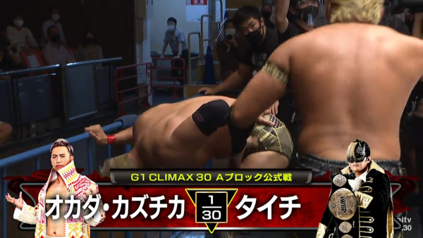 G1 Climax 30 Night 7 A Block action saw five-time former IWGP Heavyweight Champion and the winner of G1 Climax 22 and G1 Climax 24 Kazuchika Okada (CHAOS) face Suzuki-Gun member Taichi.