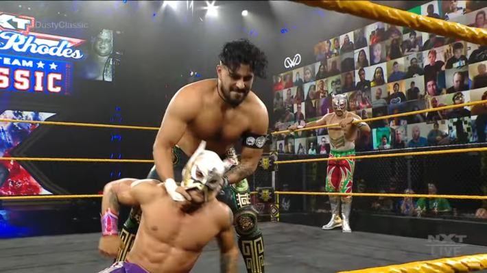 The last time Legado Del Fantasma met Lucha House Party in tag team action, they were caught off guard. They were busy hyping up their leader, the NXT Cruiserweight Champion Santos Escobar, when Gran Metalik & Lince Dorado showed up and beat them in a last minute match. Now, in the quarter finals of the Dusty Rhodes Tag Team Classic, Joaquin Widle & Raul Mendoza are more ready than before.