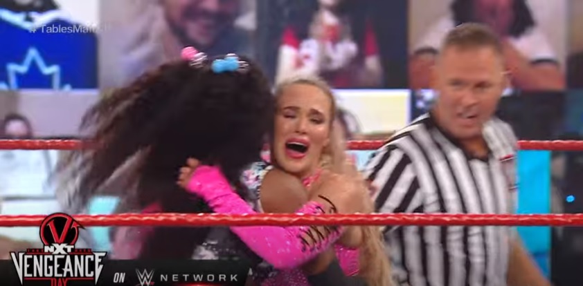 Jax tried another power bomb but held onto to Jax’s head with her legs and dropped her onto the apron.