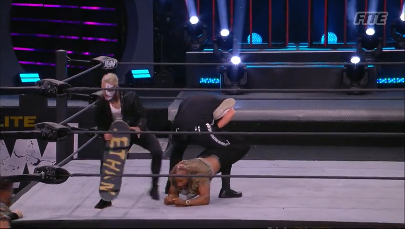 Page was kept at bay by Darby Allin and the skateboard, which had his name on it. Sky would tap out in the ring, and Sting let him go. That submission doesn’t count tonight, but it might soon. Sky & Page wanted to flee to the back, but The Dark Order cut off their escape and forced an alternative route.