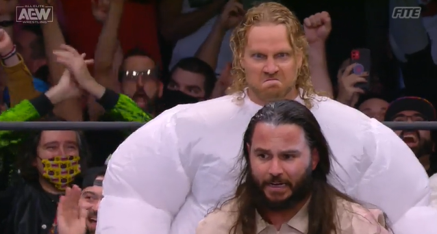 A low blow for anyone in the Dark Order followed, before a four way Proton Pack sandwich and a powerbomb onto the pile! A man in a horse costume would come to the ring, with the rest of Dark Order. He’d be kicked low and took a BTE Trigger, but it was actually Brandon Cutler! Instead, it was Hangman Page in the StayPuff Marshmallow Man costume! He’d nail Deadeye on Omega, Silver nails Spindoctor and the night was won!