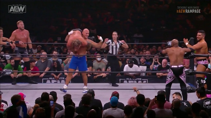 Jericho tagged in and hit a Lionsault, but Page broke the pinfall up. Hager & Dos Santos brawled, and Hager would slam him through a table. Now with Dos Santos out of the match, Jericho would focus on Scorpio Sky. He’d block the TKO attempt, and apply the Walls of Jericho. Paige VanZant ran a distraction, and Jorge Masvidal hit a knee strike to allow Sky to get the win. VanZant took a selfie, and Jericho was beaten into the mat.