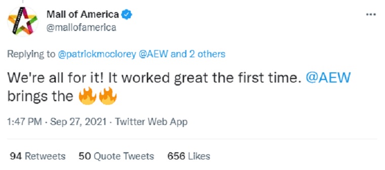 The official account for the Mall of America tweeted in response, “We’re all for it! It worked great the first time. @AEW brings the 🔥🔥.”