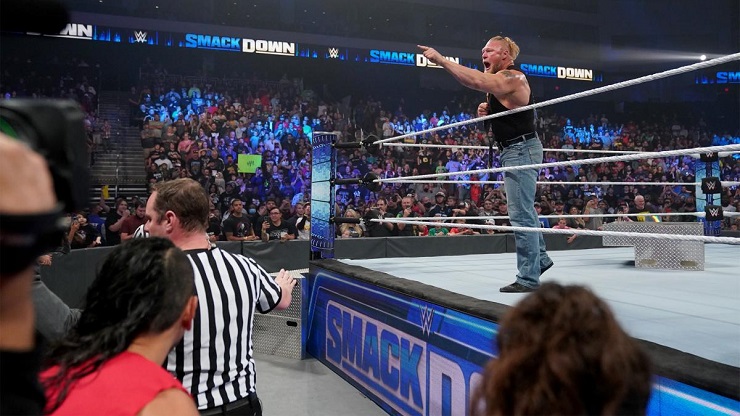 After the show opened up with a stale promo from Roman Reigns who wanted to see Lesnar show up to come through on a Twitter threat – Lesnar delivered. He would show up and raise hell, and the crowd loved it. Lesnar took out Reigns, The Usos, a referee, a camera and more. The roster rushed down to stop him, and Lesnar stood tall holding the WWE Universal Championship. Things looked great, until Adam Pearce showed up to suspend Brock indefinitely.