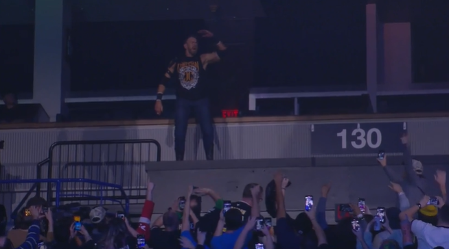Cage would climb high in the stands and dive down, but only got a two count for the stunt. They’d make their way back toward the ring, where COle hit a wheelbarrow German to the apron. Cole grabbed a black bag, a favorite tool of Hardcore Icon Britt Baker. Jungle Boy got handfuls of tacks force fed to him, as Cole held the camel clutch before double superkicks.