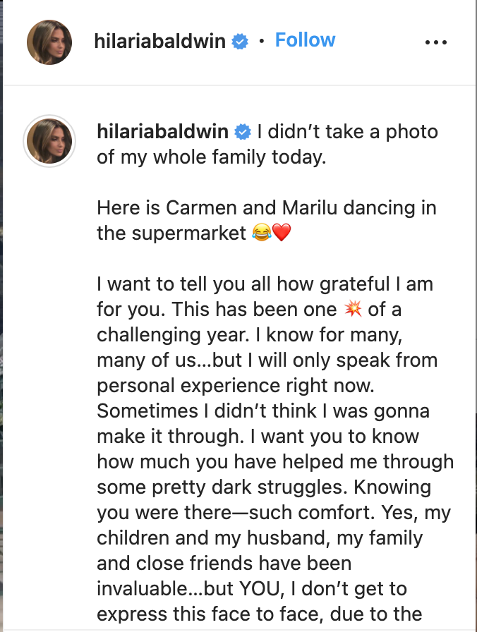 Hilaria Baldwin has opened up on what has been an extremely difficult year during the recent Thanksgiving celebration.