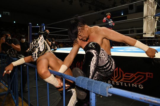 Next up was Yoshinobu Kanemaru & Taiji Ishimori, who have been bitter rivals ever since their days in NOAH. All times except once, Kanemaru wins – holding a 11-1 record over Ishimori. He jumped Ishimori from behind to start this one with a brawl, before fending off a crossface attempt in the ring. Things spilled back outside, and as the referee reached 18 on his count, Kanemaru threw a Young Lion at Ishimori, causing the count out win.