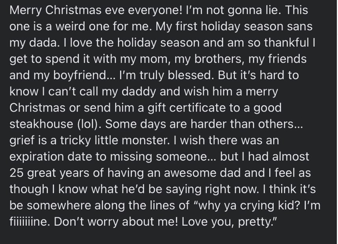 She added: “Some days are harder than others. Grief is a tricky little monster. I wish there was an expiration date to missing someone, but I had almost 25 great years of having an awesome dad.”