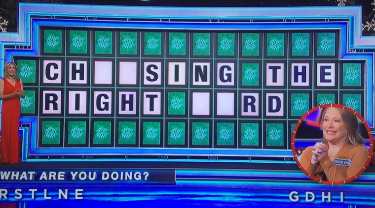 The puzzle’s theme was “What are you doing?” Rubush initially guessed “Choosing the right card” which was incorrect. In her second attempt, she correctly guessed “Choosing the right word.”