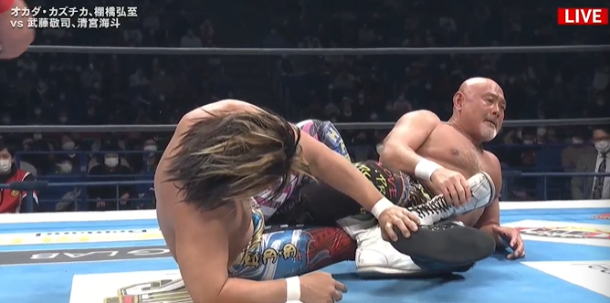 Kiyomiya would start this one off with Okada, and get taken right down to the mat. He’d look for the armbar as a counter, and was able to get control on Okada’s arm. Technical issues came, but the stream returned with Mutoh grappling with Tanahashi. They’d battle for control on the mat, before Okada would get a chance to lock up with the legend.