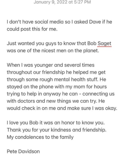 Davidson’s tribute was shared via Saturday Night Live writer Dave Sirus’ Instagram. There he said that in his friendship with Saget, he came to know him as “one of the nicest men on the planet” and that he took the time to help him and his family in dealing with his mental health issues when he was younger.