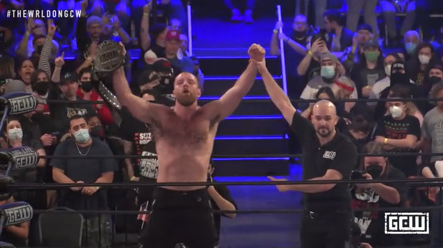 Jarrett would miss the swing, and Effy would nail Under The Rainbow for a two count. Now, Effy had the belt and dished out some punishment. Jarrett grabbed the guitar, but took a low blow. Effy pulled off the fishnets, and went after the face of Jarrett with them. Jarrett would survive and hit the guitar shot into Stroke for the win!