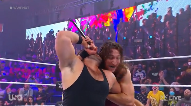 Dunne was coming in with extra anger and a hurt hand. D’Angelo would go for the crowbar, before taking some chops. A knee strike and suplex attempt would follow, with Dunne catching him in an armbar before stomping on the neck of D’Angelo. Dunne went after the crowbar but was pulled down and caught with a big capture suplex.