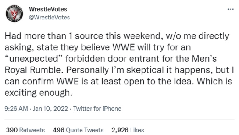 “Had more than 1 source this weekend, w/o me directly asking, state they believe WWE will try for an ‘unexpected’ forbidden door entrant for the Men’s Royal Rumble. Personally I’m skeptical it happens, but I can confirm WWE is at least open to the idea. Which is exciting enough.”