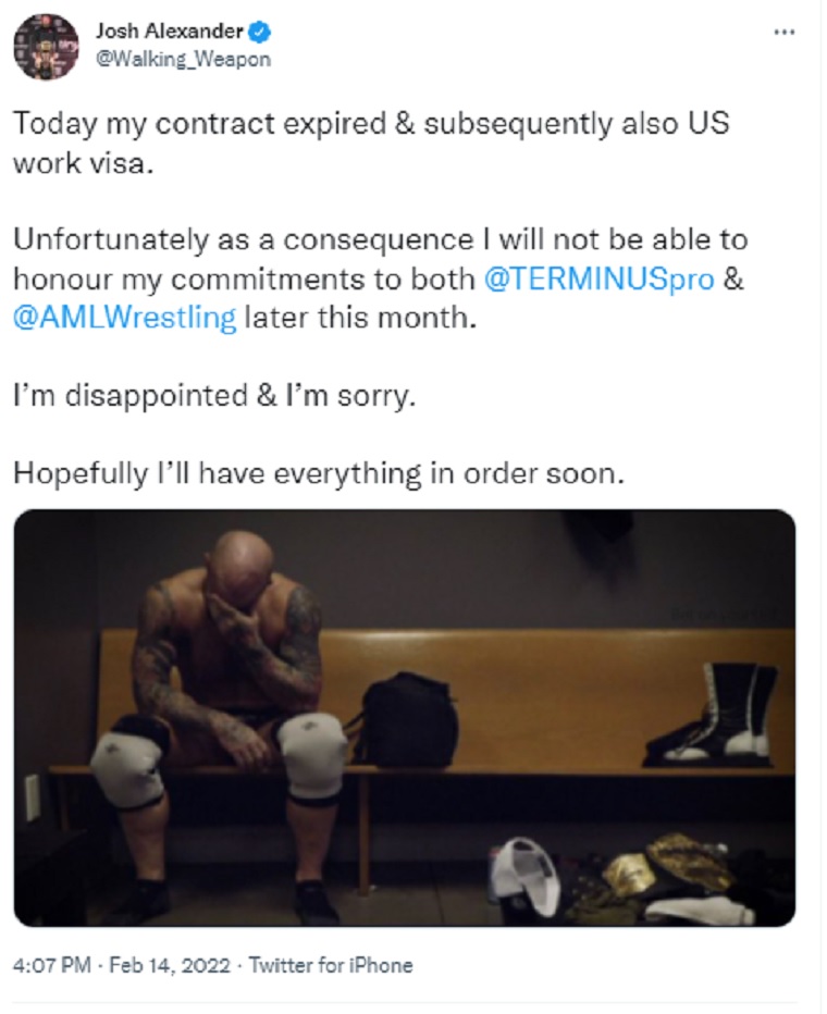 Unfortunately as a consequence I will not be able to honour my commitments to both @TERMINUSpro & @AMLWrestling later this month.