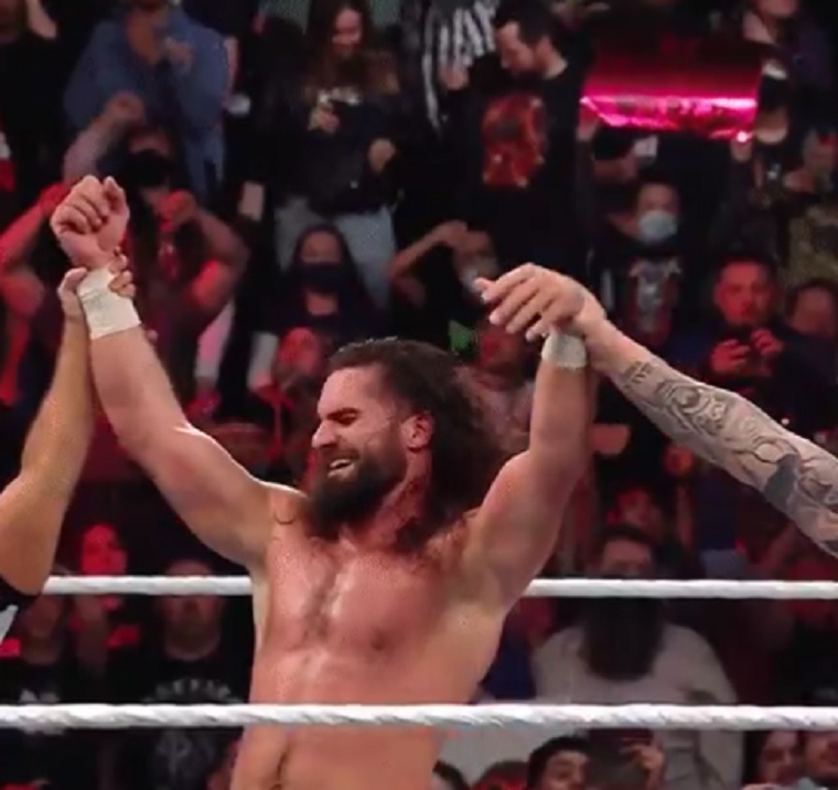 Riddle blind tagged in but Rollins outmaneuvered him and hit a Stomp for the win.