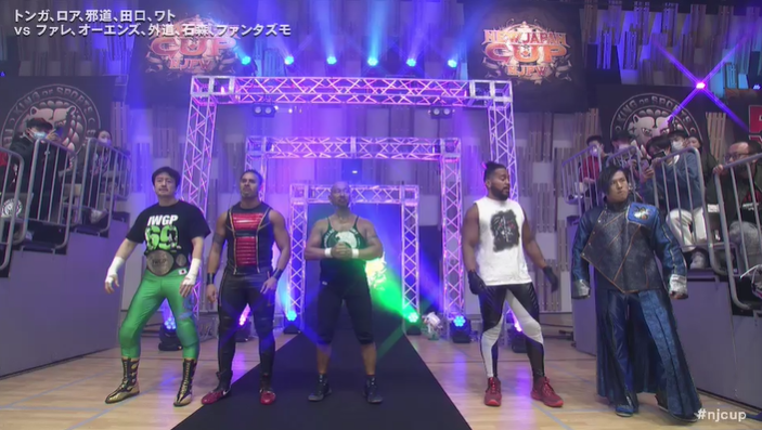 Tanahashi would kick things off alongside Goto, two former New Japan Cup winners. Goto would get the side headlock on Tanahashi, before being shoved off. Basic shoulder tackle would follow, dropping Tanahashi. Into the corner, Tanahashi would hit the back elbow and the springboard crossbody, before tagging in Kojima for a double elbow drop.