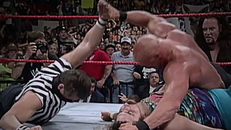 This was a falls count anywhere bout—great for Austin and perfect for Dude Love—and Vinnie Mac had his goons in every position. He served as the special guest referee because he’s literally the most impartial official ever, Pat Patterson was the guest ring announcer, Gerald Brisco was the timekeeper, and The Undertaker was the special guest enforcer.