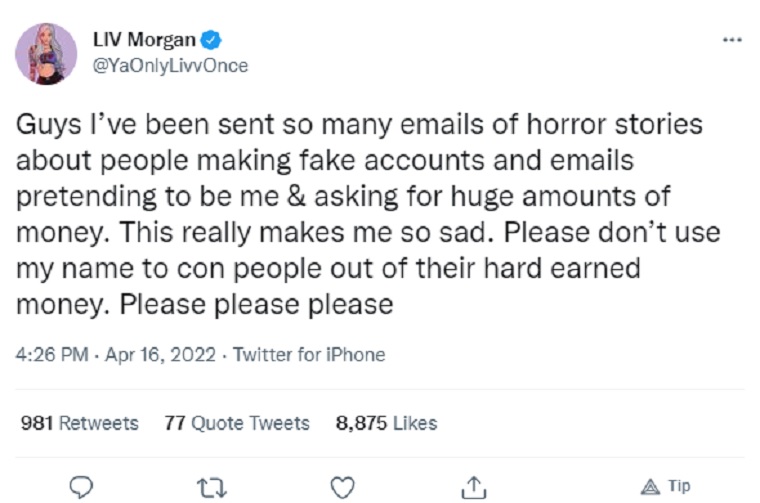 But there’s also a dark side to it as many have taken to using it to scam people out of anything they can, and Liv Morgan has found herself caught up in these shenanigans.