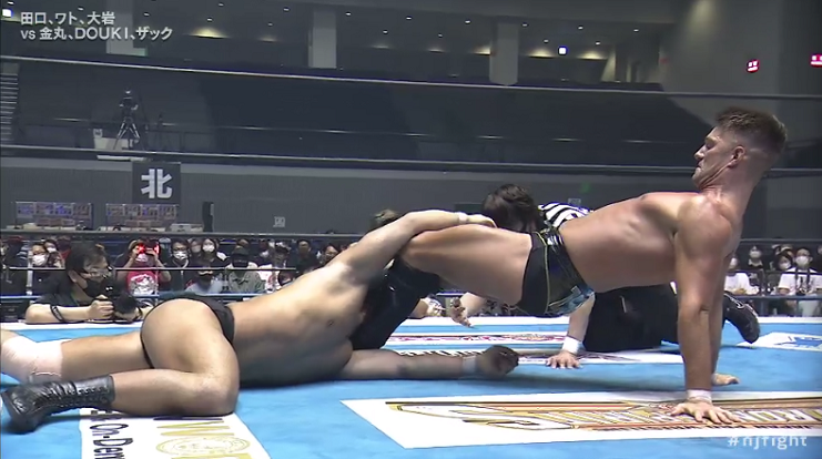 ZSJ would hit the ring, but Taguchi was able to maintain his control. Oiwa got the tag as all three men ganged up on ZSJ – and a gutwrench suplex required Kanemaru to save ZSJ. Taguchi hit a hip attack to take Kanemaru down, but in the ring, ZSJ would have to fight off the Boston Crab. He’d work his way into a neck lock just using his legs, and forced Oiwa to tap out.