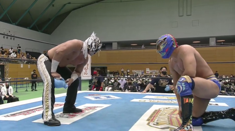 Desperado would rake the eyes of Titán before ripping at the mask. In Mexico this would be an immediate DQ, but Yamagata is firmly in Japan. Titán would throw some chops before being launched with a backdrop, and having his knee abused as Desperado set up an Indian Deathlock.