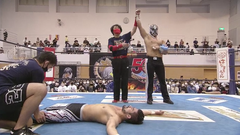 Yuta would fire back with an enziguri, before the diving crossbody for a near fall. Desperado would block the slam before hitting the dragon screw and applying Numero Dos. Yuta would find the ropes, before almost being hit with Guitarra de Angel. Instead, Desperado would go for the Numero Dos, only to be countered into an armbar.
