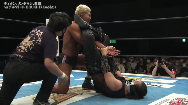 DOUKI applied the DOUKI-Chokey, before looking for the Daybreak DDT. Instead, Titán would meet Desperado in the ring with a big DDT before a thrust kick. Spinebuster would land, before Michinoku tagged in – and Titán drove him down into the match. Jado would hold Desperado & DOUKI in place for a dive from LINDAMAN before a springboard double stomp from Titán in the ring for the win.