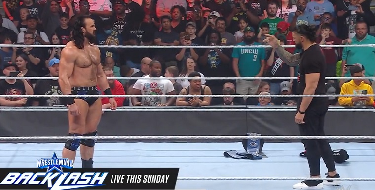 Reigns demanded everyone acknowledge him and RK-Bro took out the Usos with simultaneous RKOs and Drew McIntyre came out and Reigns didn’t look too confident.