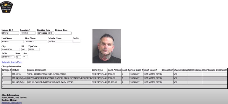 AEW star Jeff Hardy was arrested Monday in Florida on three charges, the most significant a DUI, his third offense in the last 10 years, per online court records. That is a third-degree felony. Hardy is currently in custody on $3,500 bond.