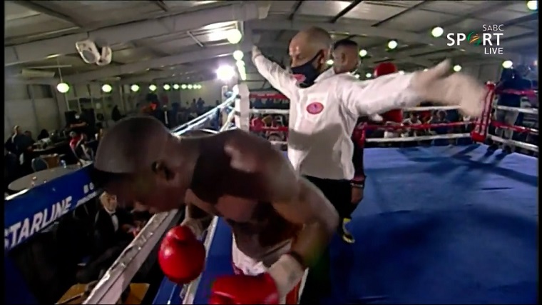 Official Elroy Marshal manages to get out of the way. Simiso Buthelezi stalks to the corner and begins throwing punches—at the air. He was fighting an opponent that the ref, Mtungwa, and the spectators. Seeing this, the referee called for the bell and the end of the fight, handing it to Mtungwa.
