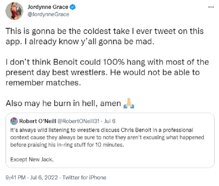 On July 6, 2022, Impact Wrestling Knockouts Champion Jordynne Grace took to Twitter to voice her opinion on Chris Benoit’s career in response to a statement about wrestlers talking about his career without excusing what he did.