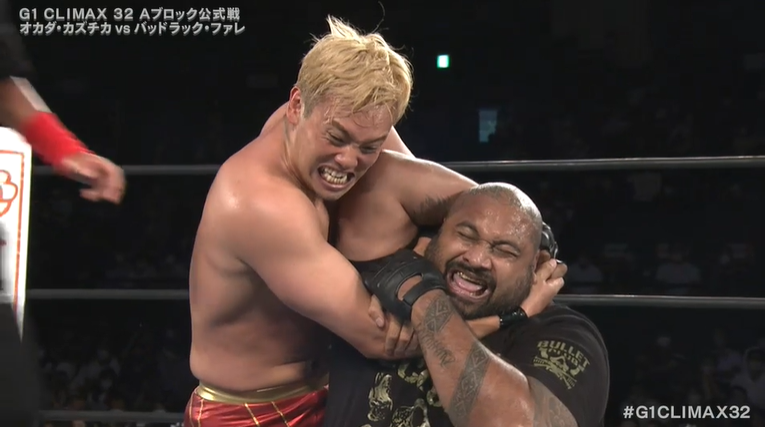 Historically in the G1 Climax, usually Fale is the one who defeats Okada – something The Rainmaker knows very well. Even with Fale less mobile in 2022, and perhaps in his final G1 – he remains a big threat. Okada would rush in with a forearm smash, before trying some shoulder tackles.