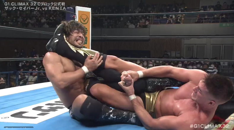 ZSJ would get the upper hand, and used the steel bars of the barricade to attack the leg of KENTA. He’d allow KENTA to get back into the ring, and would quickly go for the submission. Both legs would be attacked, but KENTA rolled free only to wind out in the Bow & Arrow stretch.