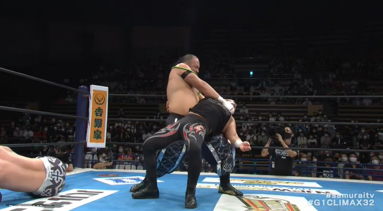 Ospreay would get free and hit the Blast Kick, and Great-O-Khan got the tag. SHO would get driven into the corner, before a snap suplex for a two count. Togo would pull away the corner pad, allowing SHO to whip Great-O-Khan into the exposed steel, before a House of Torture charge and a Fisherman Buster.