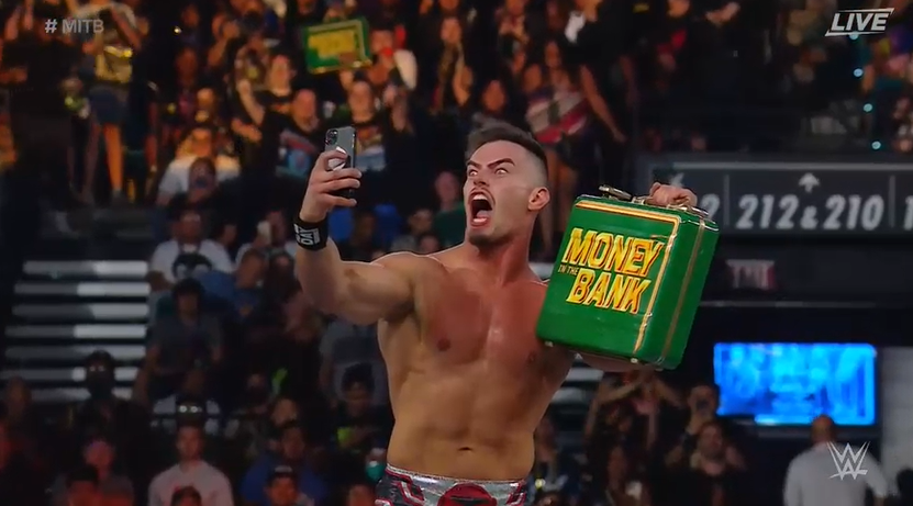 Riddle hit the ring with a massive ladder, and Rollins would play defence – before a super RKO off the ladder!! Theory would be there to stop Riddle on top of the ladder, and would shove Riddle down before claiming the briefcase!