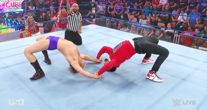 Bodhi Hayward & Thea Hail would hype Chase up, and some jabs and a Manhattan Drop would be followed with a smooth Russian Leg Sweep. The Chase U stomps had the arena on fire, before a Side Effect was met by a tight Fujiwara Armbar.