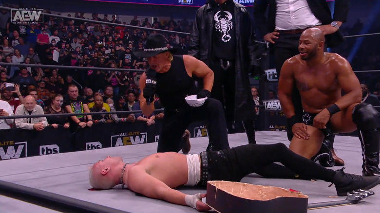 Someone dressed as Sting would attack Allin on the floor, setting up Lethal Injection for the victory. It would be revealed as Cole Karter – a member of The Factory. The crowd was baffled by this. The music of Sting would hit. Instead, Jeff Jarrett would make his AEW debut – and hit him with a guitar – and declared that the biggest weakness of Allin was his reliance on Sting.