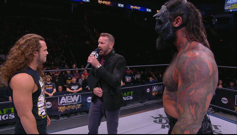 Before this match, we had ‘Jungle Boy’ Jack Perry promise to make his challenge for Full Gear clear tonight. Luchasaurus & Christian Cage were out first, Cage’s arm still in a sling. Perry would be asked to come make that challenge face to face – and he’d happily enter the ring with his former partners.